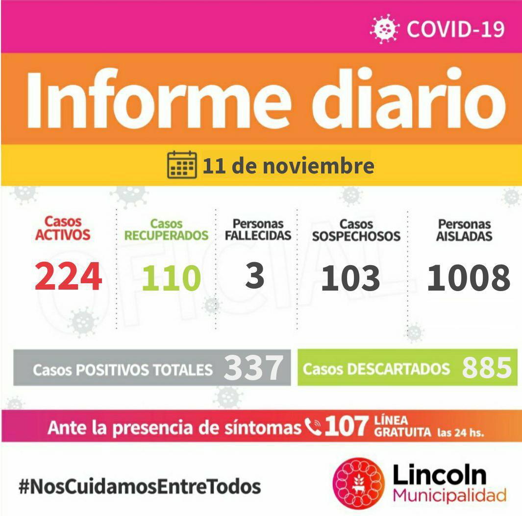 En total, registran 224 Casos Activos (169 en Lincoln, 15 en El Triunfo, 14 en Arenaza, 8 en Roberts, 6 en Martínez de Hoz, 5 en Pasteur, 3 en Carlos Salas, 2 en Las Toscas, 1 en Bayauca y 1 en Bermúdez).