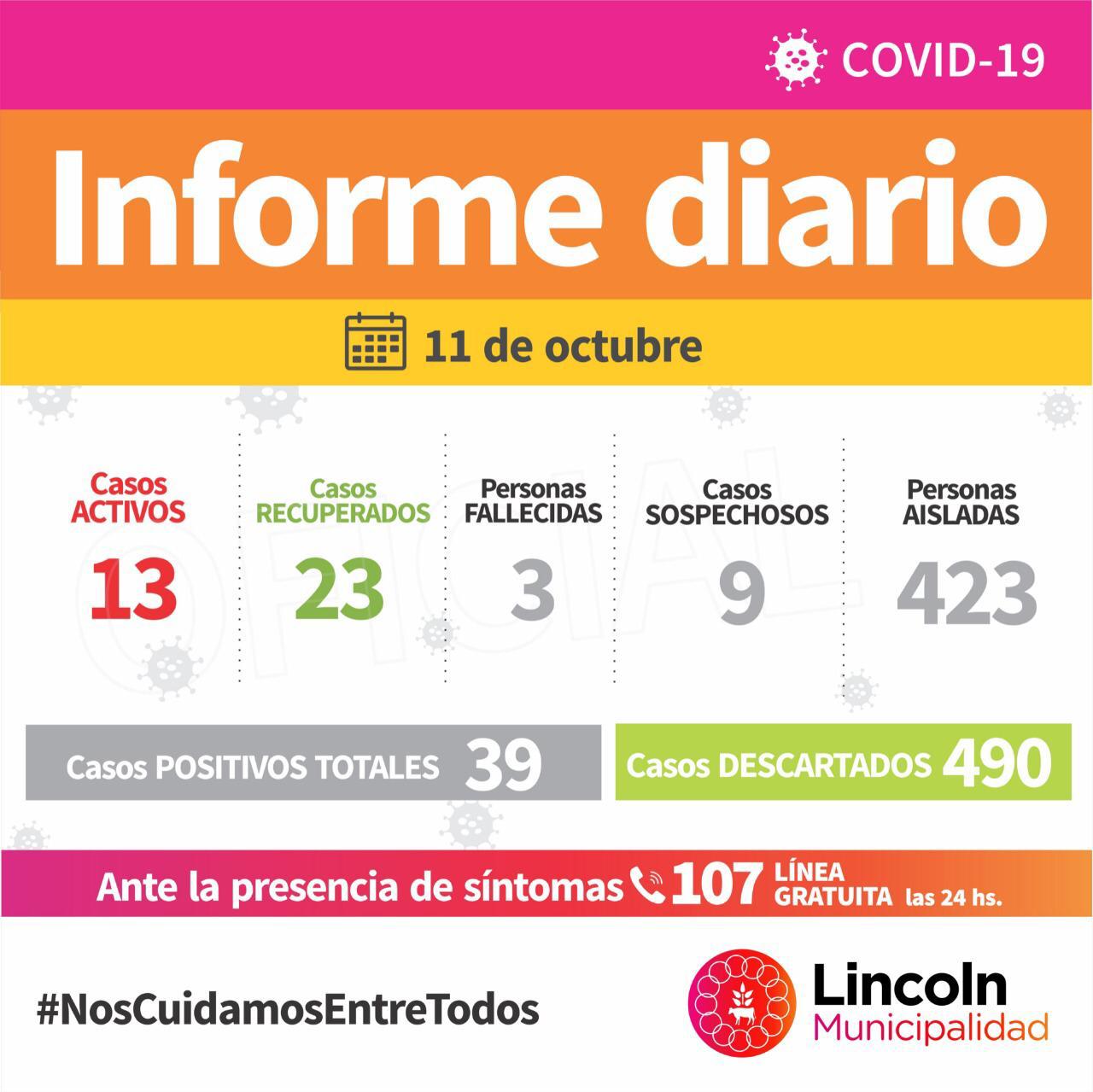 Por otro lado, la fecha, se contabilizan 13 Casos Activos, 9 de los cuales residen en Lincoln, 3 en Roberts, y 1 en Pasteur.