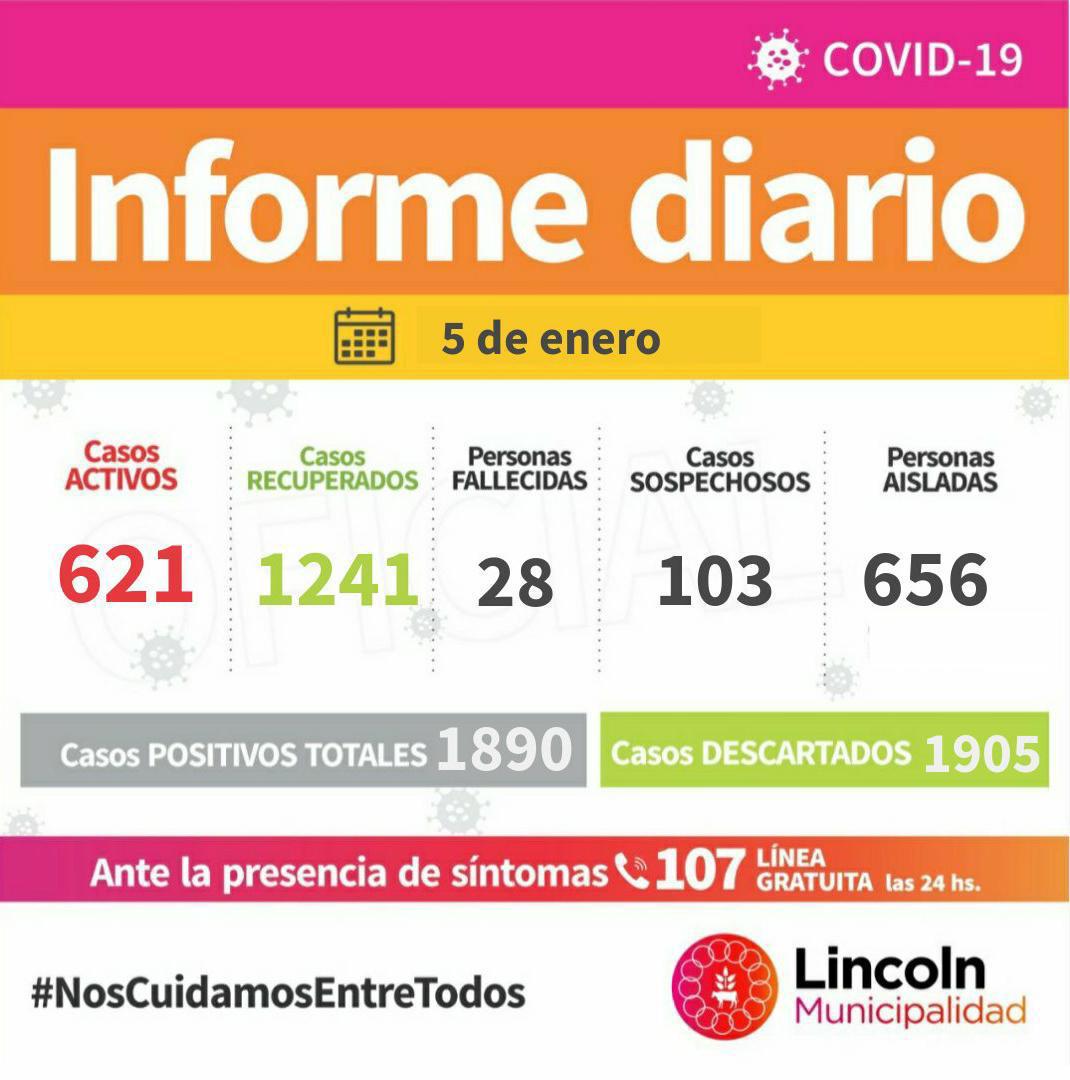 En total, se registran 621 Casos Activos, residiendo 555 en Lincoln, 17 en Arenaza, 23 en Roberts, 8 en Bayauca, 8 en El Triunfo, 5 en Pasteur, 1 en Bermúdez y 4 en Las Toscas.