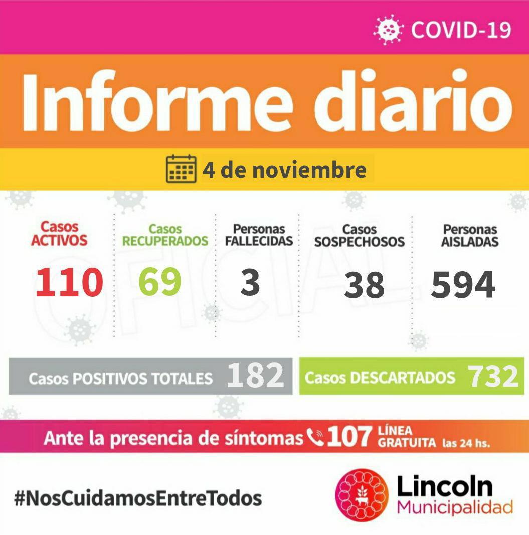 De esta manera, a la fecha, se registran 110 Casos Activos, 74 residentes en Lincoln, 17 en Arenaza, 8 en Roberts, 4 en El Triunfo, 4 en Martínez de Hoz, 1 en Bayauca, 1 en Las Toscas, y 1 en Carlos Salas.