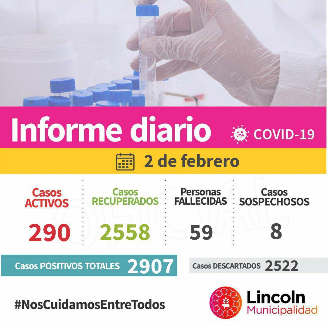 En total, se registran 290 Casos Activos (268 en Lincoln, 4 en Roberts, 3 en Bayauca, 7 en El Triunfo, 5 en Martínez de Hoz, 1 en Las Toscas y 2 en Pasteur).