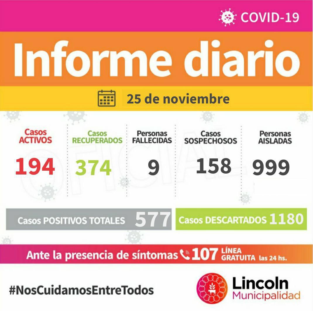 En total, se registran 194 Casos Activos (165 en Lincoln, 11 en El Triunfo, 7 en Arenaza, 8 en Roberts, 1 en Martínez de Hoz, 2 en Las Toscas).