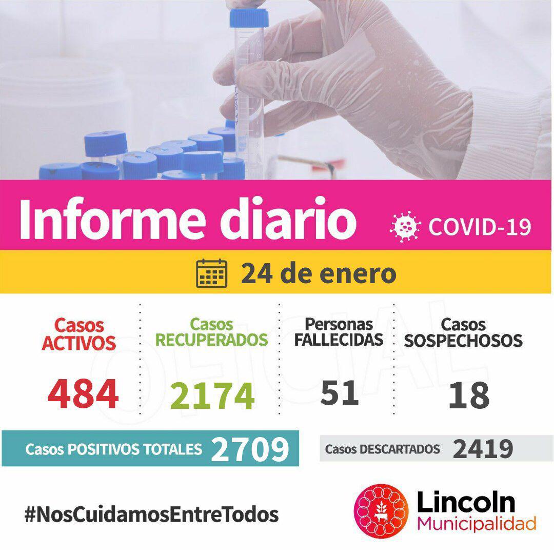 A su vez, 31 pacientes recibieron el alta médica, siendo 30 de Lincoln y 1 de Arenaza. De esta manera, en total se registran 484 casos activos, residiendo 439 en Lincoln, 3 en Arenaza, 6 en Roberts, 19 en Bayauca, 3 en El Triunfo, 1 en Pasteur, 6 en Martínez de Hoz, 2 en Triunvirato y 5 en Las Toscas.