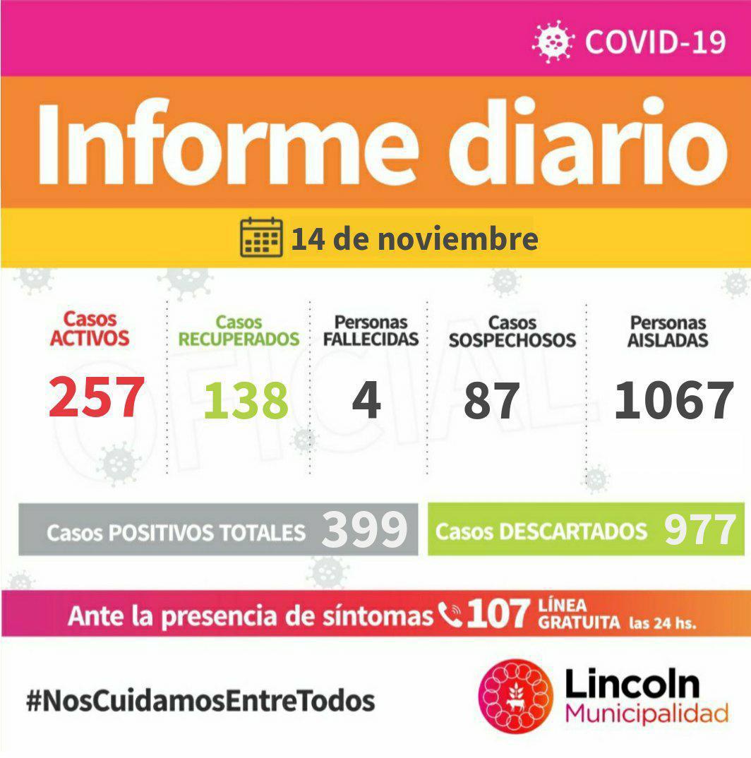 En total, se registran 257 Casos Activos (205 en Lincoln, 13 en El Triunfo, 13 en Arenaza, 8 en Roberts, 7 en Martínez de Hoz, 6 en Pasteur, 3 en Carlos Salas, 2 en Las Toscas).