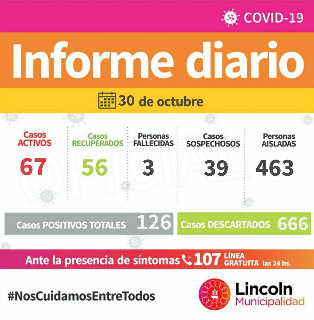 De esta manera, a la fecha, se registran 67 Casos Activos, 52 en Lincoln, 8 en Roberts, 4 en Arenaza, 2 en El Triunfo, y 1 en Pasteur.