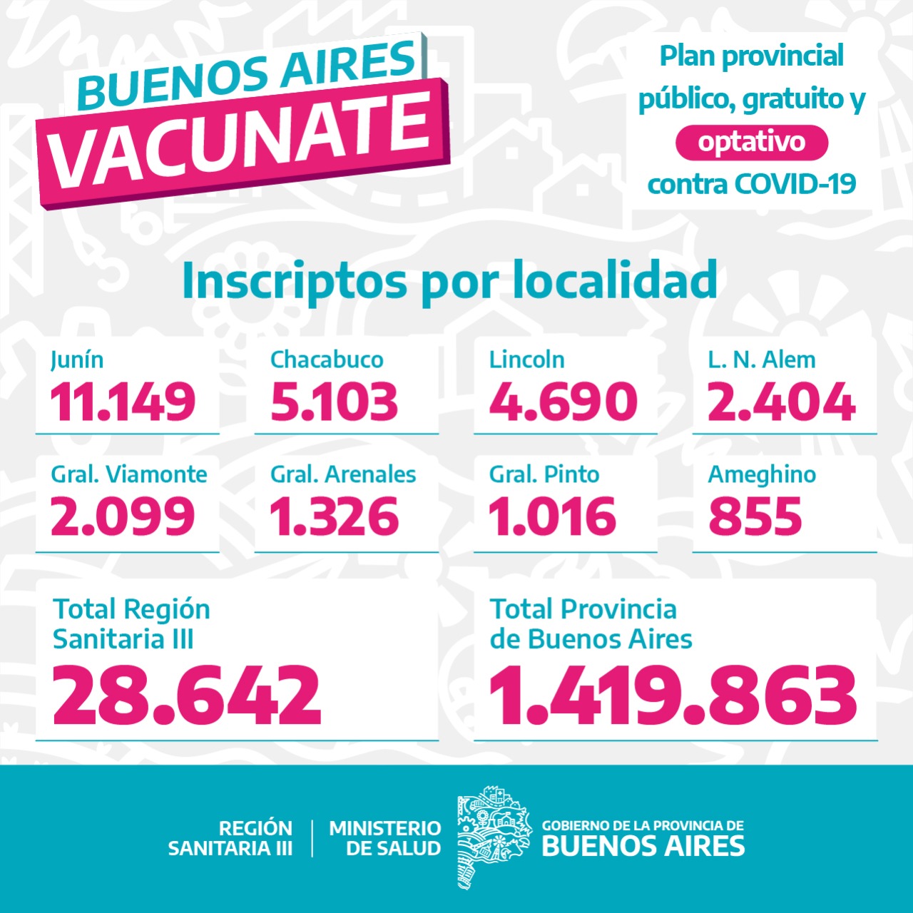 Con la llegada de la vacuna contra el Covid-19, desde el Gobierno Provincial lanzaron la campaña “Buenos Aires Vacunate”. El plan público, gratuito y optativo ya cuenta con más de un millón y medio de inscriptos. Lincoln, que pertenece a la Región Sanitaria III, según datos de la semana pasada, cuenta con 4.690 personas anotadas y se encuentra por detrás de Junín (11.149) y Chacabuco (5.103). El total de la Región es de 28.642 inscriptos. Cabe destacar que para registrase, se puede ingresar a https://vacunate.ms.gba.gov.ar/ y Punto Digital, en Alem 1072 de Lincoln.