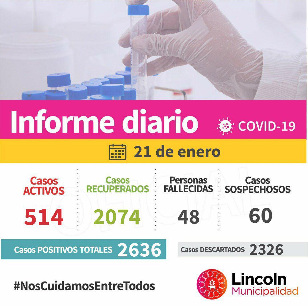 De esta manera en total, se registran 514 Casos Activos, residiendo 475 en Lincoln, 2 en Arenaza, 3 en Roberts, 19 en Bayauca, 2 en El Triunfo, 1 en Pasteur, 6 en Martínez de Hoz, 2 en Triunvirato y 4 en Las Toscas.