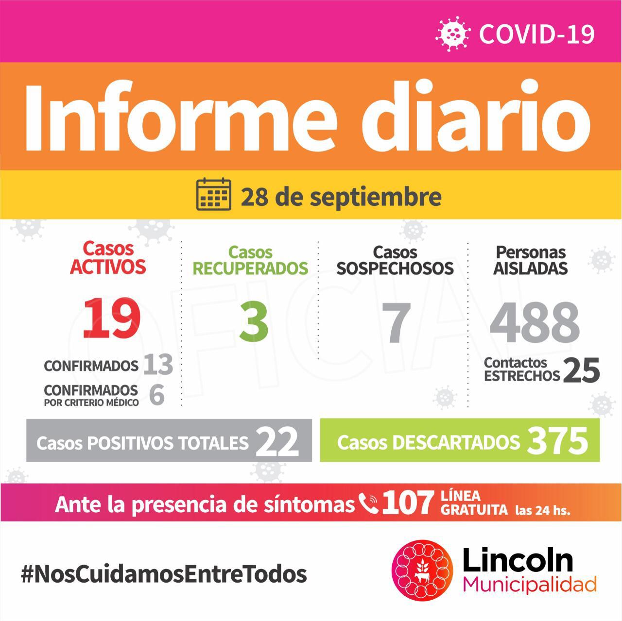En las últimas horas se reportaron dos nuevos casos activos. Se trata de un hombre de unos 75 años de edad, internado en el Hospital Municipal que dio positivo de la prueba PCR de COVID-19; y una mujer de unos 25 años de edad profesional de la Salud que se desempeña laboralmente fuera de nuestro distrito, quien fue hisopada en su lugar de trabajo y permanece aislada en su domicilio. Ambos pacientes residen en Lincoln.