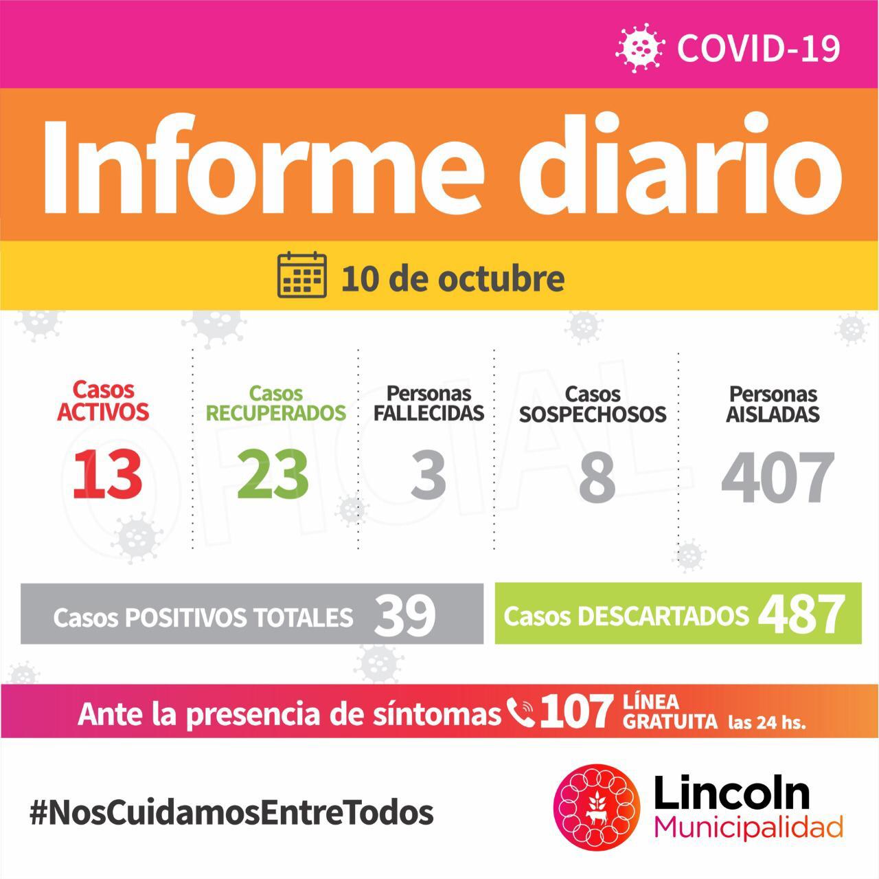 De esta manera, a la fecha, se registran 13 Casos Activos, 9 de los cuales residen en Lincoln, 3 en Roberts, y 1 en Pasteur. En tanto, en las últimas horas, se detectaron 4 nuevos casos sospechosos; por quienes se aguarda el resultado de los hisopados.