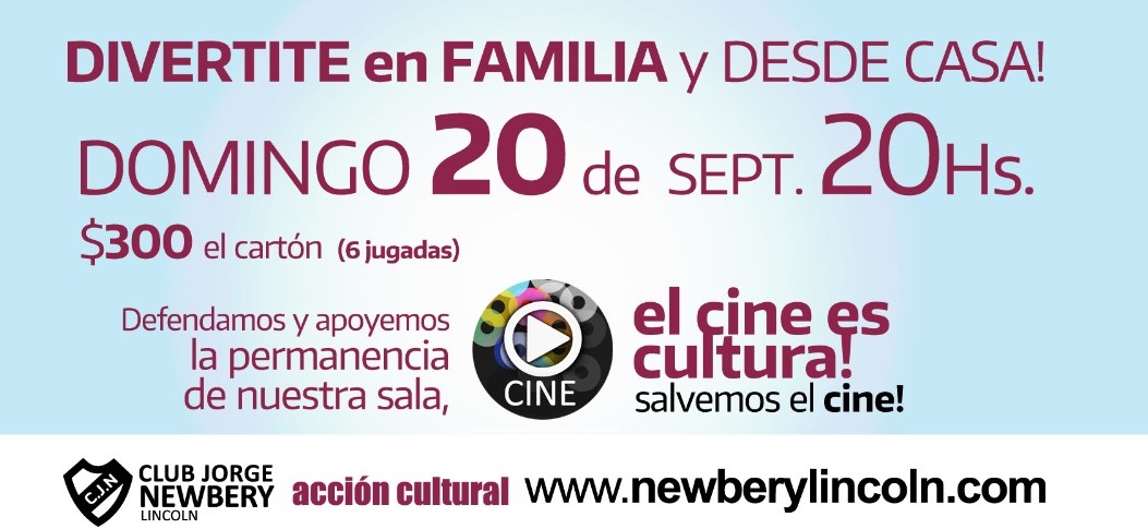 En el marco de su 105 aniversario, el Cine Club Jorge Newbery lanza un Bingo con importantes premios, con el objetivo de mantener las instalaciones del club en este contexto de pandemia. El sorteo se realizará el domingo 20 de septiembre a las 20 hs por el Facebook del Club Jorge Newbery Lincoln: https://www.facebook.com/clubjorgenewberylincoln