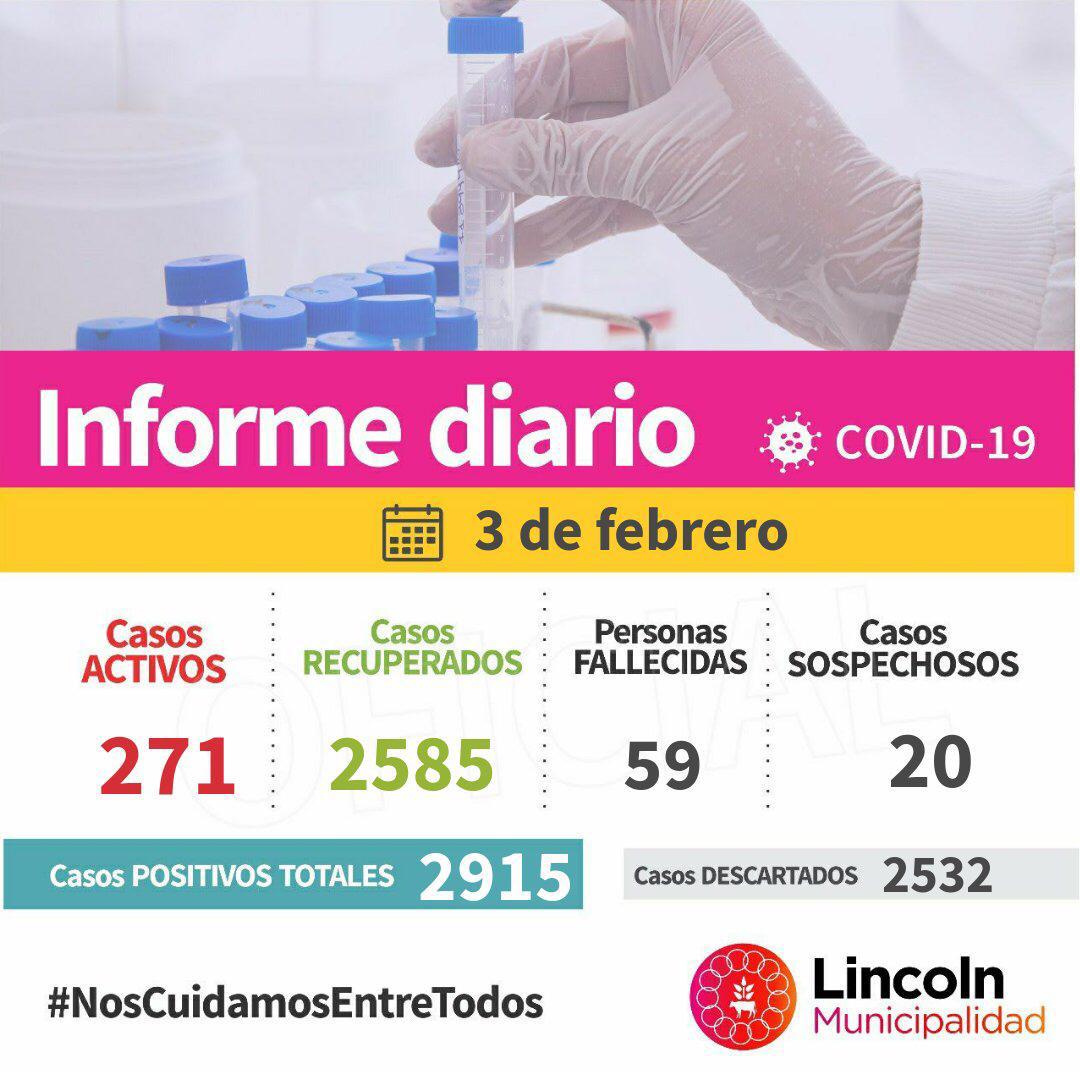 En total, se registran 271 Casos Activos (251 en Lincoln, 3 en Roberts, 3 en Bayauca, 6 en El Triunfo, 5 en Martínez de Hoz, 1 en Las Toscas y 2 en Pasteur).
