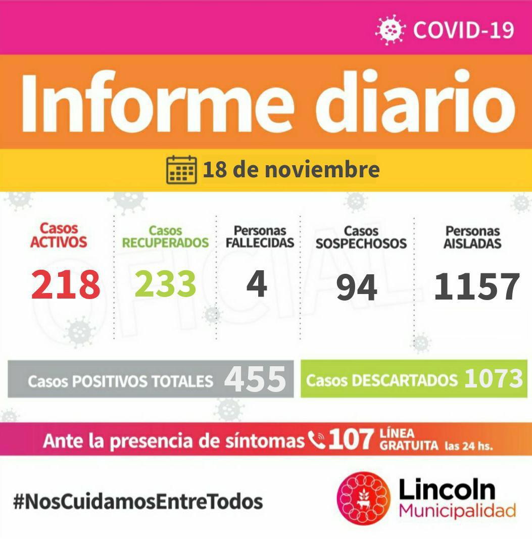 Tras el informe entregado por la Secretaria de Salud del municipio de Lincoln, informaron que se registraron 13 nuevos casos activos. De los cuales se confirmaron 7 por hisopado PCR, 1 por test de antígeno, 4 por laboratorio privado, y 1 por criterio clínico epidemiológico. Se trata de 12 personas de Lincoln y 1 de El Triunfo.